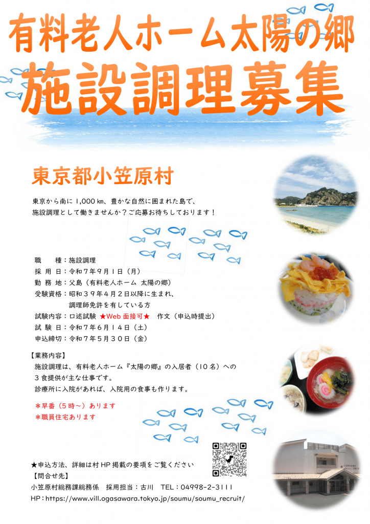 小笠原村職員の調理師として、有料老人ホーム「太陽の郷」で働きませんか?